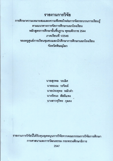 การศึกษาความเหมาะสมและความพึงพอใจต่อการจัดกระบวนการเรียนรู้ตามแนวทางการจัดการศึกษานอกโรงเรียน หลักสูตรการศึกษาขั้นพื้นฐาน พุทธศักราช 2544 ภาคเรียนที่ 1/2546 ของครูศูนย์การเรียนชุมชนและนักศึกษาการศึกษานอกโรงเรียน จังหวัดพิษณุโลก / สุรพล วรเลิศ...[และคนอื่น ๆ]