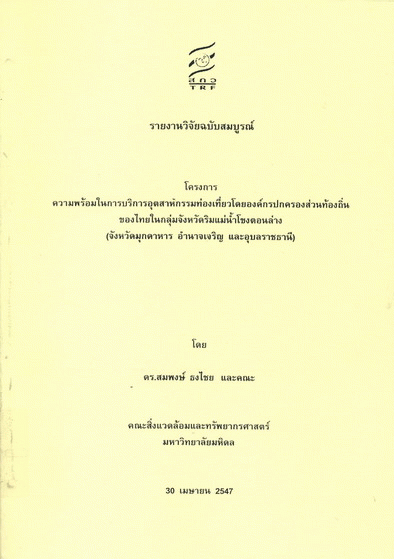 โครงการความพร้อมในการบริการอุตสาหกรรมท่องเที่ยวโดยองค์กรปกครองส่วนท้องถิ่นของไทยในกลุ่มจังหวัดริมแม่น้ำโขงตอนล่าง (จังหวัดมุกดาหาร อำนาจเจริญ และอุบลราชธานี) / สมพงษ์ ธงไชย และคณะ.