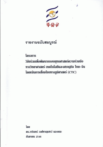 โครงการวิจัยร่วมเพื่อพัฒนากรอบยุทธศาสตร์ความร่วมมือทางวิทยาศาสตร์เทคโนโลยีและเศรษฐกิจไทย-จีน โดยเน้นการเชื่อมโยงทางภูมิศาสตร์ (CTC) / วารินทร์ วงศ์หาญเชาว์ และคณะ.