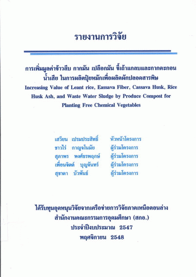 การเพิ่มมูลค่าข้าวลีบ กากมัน เปลือกมัน ขี้เถ้าแกลบและกากตะกอน น้ำเสีย ในการผลิตปุ๋ยหมักเพื่อผลิตผักปลอดสารพิษ = Increasing value of Leant rice, Eassava Fiber, Cassava Husk, Rice Husk Ash, and Waste Water Sludge by produce compost for planting free chemical vegetables / เสวียน เปรมประสิทธิ์...[และคนอื่น ๆ]