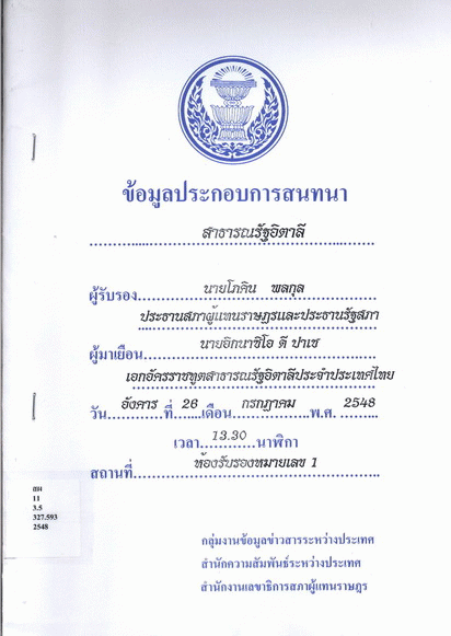 National Assembly Library of Thailand | Parliamentary Publications Collection | Parliamentary Publications Shelves | สผ 11 3.5 327.593 2548 (เรียกดูชั้นหนังสือ(เปิดด้านล่าง)) | พร้อมให้บริการ | 3961156860 |