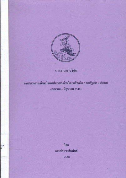การสำรวจความพึงพอใจของประชาชนต่อนโยบายด้านต่าง ๆ ของรัฐบาล 9 ประการ (เมษายน - มิถุนายน 2548) / กรมประชาสัมพันธ์.