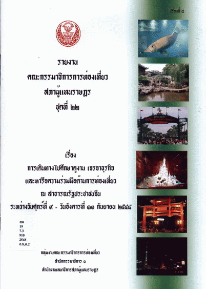 รายงานคณะกรรมาธิการการท่องเที่ยว สภาผู้แทนราษฎร ชุดที่ 22 เรื่อง การเดินทางไปศึกษาดูงาน เจรจาธุรกิจและหารือความร่วมมือด้านการท่องเที่ยว ณ สาธารณรัฐประชาชนจีน ระหว่างวันศุกร์ที่ 9- วันอังคารที่ 13 กันยายน 2548 / สำนักกรรมาธิการ 3 สำนักงานเลขาธิการสภาผู้แทนราษฎร.