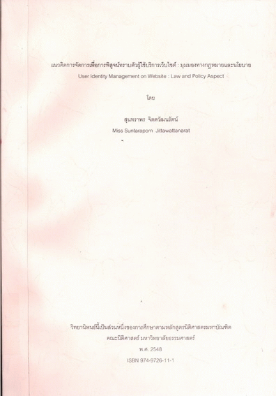 แนวคิดการจัดการเพื่อการพิสูจน์ทราบตัวผู้ใช้บริการเว็บไซต์ : มุมมองทางกฎหมายและนโยบาย / สุนทราพร จิตตวัฒนรัตน์.