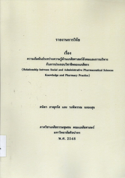 ความสัมพันธ์ระหว่างความรู้ด้านเภสัชศาสตร์สังคมและการบริหารกับการประกอบวิชาชีพของเภสัชกร = Relationship between social and administrative pharmaceutical sciences knowledge and pharmacy practice / ดนิตา ภาณุจรัส และระพีพรรณ ฉลองสุข.