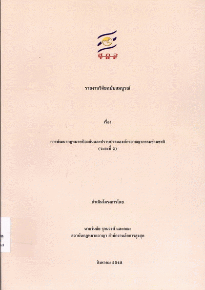 การพัฒนากฎหมายป้องกันและปราบปรามองค์กรอาชญากรรมข้ามชาติ (ระยะที่ 2) : ความรับผิดของนิติบุคคลกรณีมีส่วนร่วมในองค์กรอาชญากรรมข้ามชาติ (เล่ม 7) ความรับผิดของนิติบุคคลกรณีมีส่วนร่วมในองค์กรอาชญากรรมข้ามชาติ (เล่ม 7) / วันชัย รุจนวงศ์และคณะ
