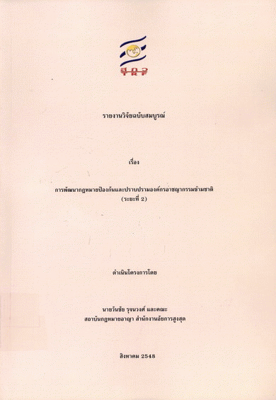 การพัฒนากฎหมายป้องกันและปราบปรามองค์กรอาชญากรรมข้ามชาติ (ระยะที่ 2) : มาตรการในการแก้ไขปัญหาการผลิตและการค้าอาวุธโดยผิดกฎหมาย (พิธีสารเพื่อต่อต้านการผลิตและการค้าอาวุธโดยผิดกฎหมาย) (เล่ม 17) / วันชัย รุจนวงศ์.