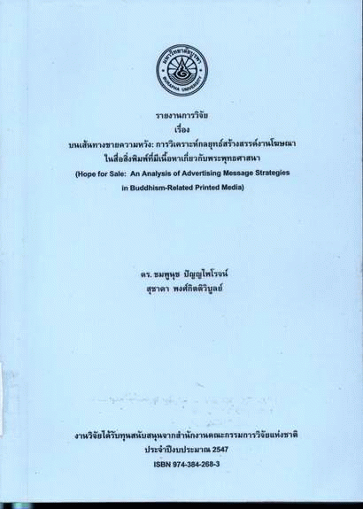 บนเส้นทางขยายความหวัง : การวิเคราะห์กลยุทธ์สร้างสรรค์งานโฆษณาในสื่อสิ่งพิมพ์ที่มีเนื้อหาเกี่ยวกับพระพุทธศาสนา / ชมพูนุช ปัญญไพโรจน์, สุชาดา พงศ์กิตติวิบูลย์.