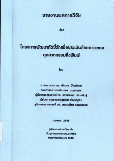 โครงการพัฒนาตัวชี้วัดเพื่อประเมินศักยภาพของอุตสาหกรรมสิ่งพิมพ์ / อัจฉรา จันทร์ฉาย...[และคนอื่น ๆ]