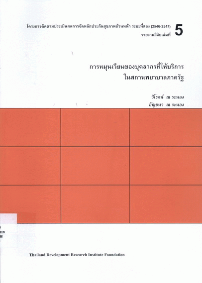 การหมุนเวียนของบุคลากรที่ให้บริการในสถานพยาบาลภาครัฐ : โครงการติดตามประเมินผลการจัดหลักประกันสุขภาพถ้วนหน้า ระยะที่สอง (2546-2547) รายงานวิจัยเล่มที่ 5 / วิโรจน์ ณ ระนอง และอัญชนา ณ ระนอง.