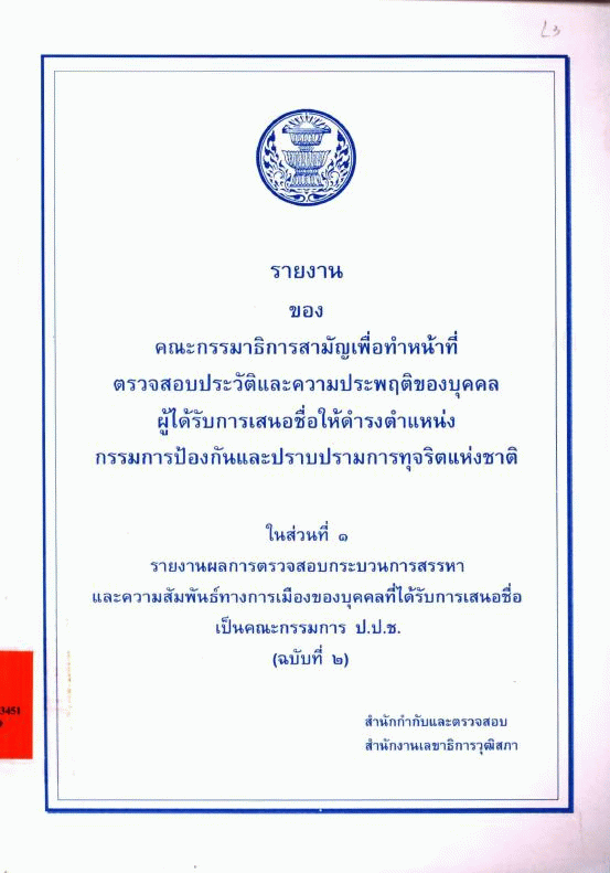 รายงานของคณะกรรมาธิการสามัญเพื่อทำหน้าที่ตรวจสอบประวัติและความประพฤติของบุคคลผู้ได้รับการเสนอชื่อให้ดำรงตำแหน่งกรรมการป้องกันและปราบปรามการทุจริตแห่งชาติ ในส่วนที่ 1 รายงานผลการตรวจสอบกระบวนการสรรหาและความสัมพันธ์ทางการเมืองของบุคคลที่ได้รับการเสนอชื่อเป็น... / สำนักกำกับและตรวจสอบ สำนักงานเลขาธิการวุฒิสภา.