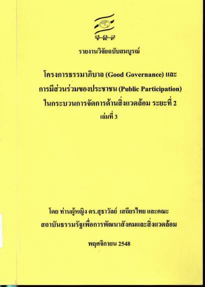โครงการธรรมาภิบาล (Good Governance) และการมีส่วนร่วมของประชาชน (Public Participation) ในกระบวนการจัดการด้านสิ่งแวดล้อม ระยะที่ 2 เล่มที่ 3 / ท่านผู้หญิง ดร. สุธาวัลย์ เสถียรไทยและคณะ.