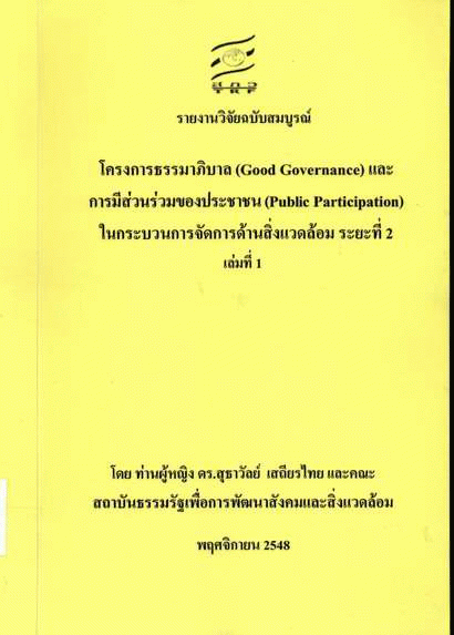 โครงการธรรมาภิบาล (Good Governance) และการมีส่วนร่วมของประชาชน (Public Participation) ในกระบวนการจัดการด้านสิ่งแวดล้อม ระยะที่ 2 เล่มที่ 1 / ท่านผู้หญิง ดร. สุธาวัลย์ เสถียรไทย และคณะ.