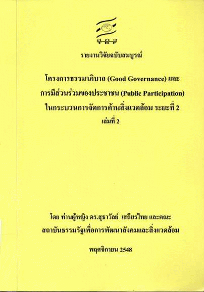โครงการธรรมาภิบาล (Good Governance) และการมีส่วนร่วมของประชาชน (Public Participation) ในกระบวนการจัดการด้านสิ่งแวดล้อม ระยะที่ 2 เล่มที่ 2 / ท่านผู้หญิง ดร. สุธาวัลย์ เสถียรไทยและคณะ.