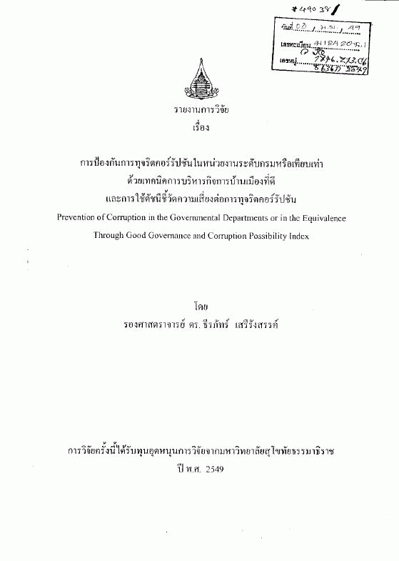 การป้องกันการทุจริตคอร์รัปชั่นในหน่วยงานระดับกรมหรือเทียบเท่า ด้วยเทคนิคการบริหารกิจการบ้านเมืองที่ดีและการใช้ดัชนีชี้วัดความเสี่ยงต่อการทุจริตคอร์รัปชั่น ธีรภัทร์ เสรีรังสรรค์.