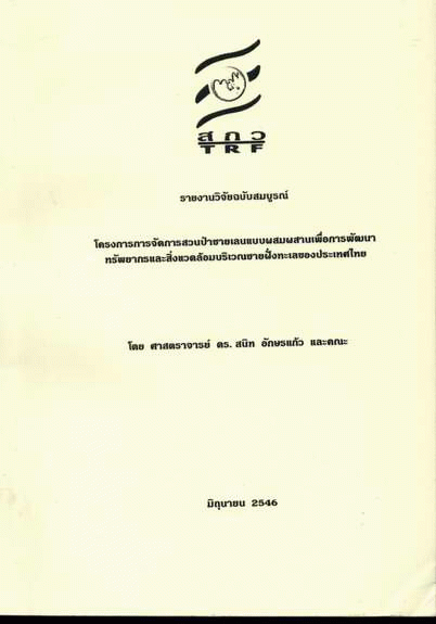 การจัดการสวนป่าชายเลนแบบผสมผสานเพื่อการพัฒนาทรัพยากรและสิ่งแวดล้อมบริเวณชายฝั่งทะเลของประเทศไทย / เสาวภา อังสุภานิช.