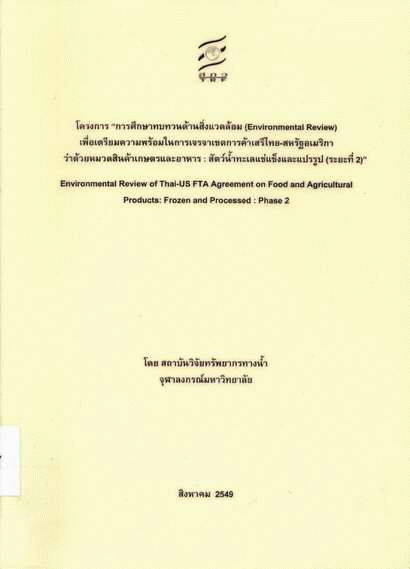 การศึกษาทบทวนด้านสิ่งแวดล้อม (Environmental Review) เพื่อเตรียมความพร้อมในการเจรจาเขตการค้าเสรีไทย-สหรัฐอเมริกาว่าด้วยหมวดสินค้าเกษตรและอาหาร : สัตว์น้ำทะเลแช่แข็งและแปรรูป (ระยะที่ 2) / เผดิมศักดิ์ จารยะพันธุ์