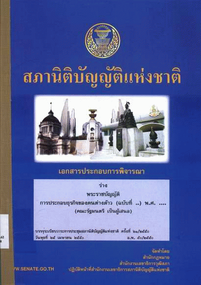 เอกสารประกอบการพิจารณาร่างพระราชบัญญัติการประกอบธุรกิจของคนต่างด้าว (ฉบับที่ ..) พ.ศ. .... (คณะรัฐมนตรี เป็นผู้เสนอ) บรรจุระเบียบวาระการประชุมสภานิติบัญญัติแห่งชาติ ครั้งที่ 21/2550 วันพุธที่ 25 เมษายน 2550 อ.พ. 50/2550 / สำนักกฎหมาย สำนักงานเลขาธิการวุฒิสภา ปฏิบัติหน้าที่สำนักงานเลขาธิการสภานิติบัญญัติแห่งชาติ.