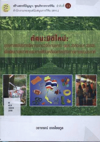 ทัศนะมิติใหม่ : ยุทธศาสตร์บริหารจัดการงานวิจัยยางพารา (พ.ศ. 2550- พ.ศ. 2553) เพื่อพัฒนาอุตสาหกรรมยางให้ขับเคลื่อนเศรษฐกิจการยางของประเทศ / วราภรณ์ ขจรไชยกูล.