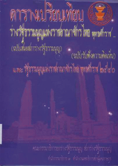 ตารางเปรียบเทียบร่างรัฐธรรมนูญแห่งราชอาณาจักรไทย พุทธศักราช .... (ฉบับเสนอสภาร่างรัฐธรรมนูญ) และรัฐธรรมนูญแห่งราชอาณาจักรไทย พุทธศักราช 2540 (ฉบับรับฟังความคิดเห็น) / คณะกรรมาธิการยกร่างรัฐธรรมนูญ. สภาร่างรัฐธรรมนูญ