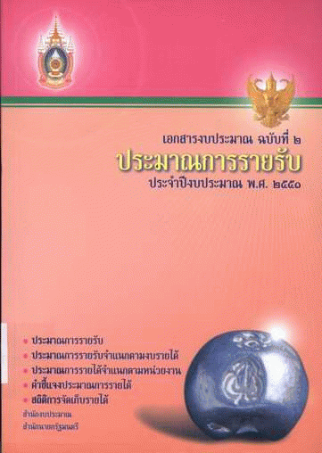 เอกสารงบประมาณ ฉบับที่ 2 ประมาณการรายรับประจำปีงบประมาณ พ.ศ. 2551 ประมาณการรายรับ ประมาณการรายรับจำแนกตามงบรายได้ ประมาณการรายได้จำแนกตามหน่วยงาน คำชี้แจงประมาณการรายได้ สถิติการจัดเก็บรายได้ / สำนักงบประมาณ.