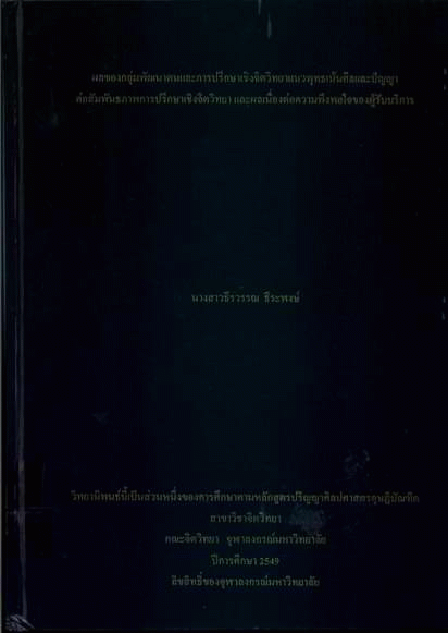 ผลของกลุ่มพัฒนาตนและการปรึกษาเชิงจิตวิทยาแนวพุทธเน้นศีลและปัญญาต่อสัมพันธภาพการปรึกษาเชิงจิตวิทยา และผลเนื่องต่อความพึงพอใจของผู้รับบริการ / ธีรวรรณ ธีระพงษ์.