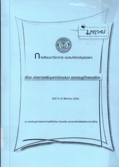 การสัมมนาวิชาการ ชมรมห้องสมุดเฉพาะ เรื่อง ช่องทางเพิ่มมูลค่าห้องสมุด ยุคเศรษฐกิจพอเพียง / ชมรมห้องสมุดเฉพาะ. สมาคมห้องสมุดแห่งประเทศไทย