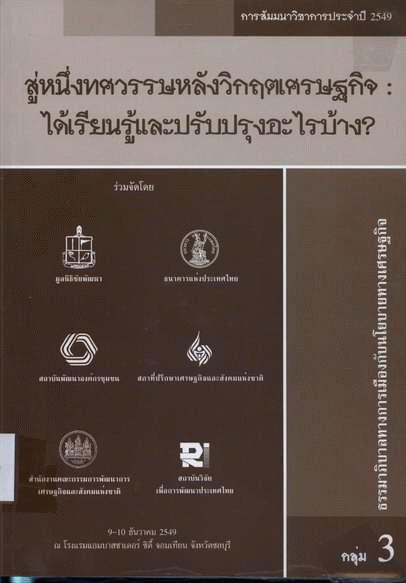 สู่หนึ่งทศวรรษหลังวิกฤตเศรษฐกิจ : ได้เรียนรู้และปรับปรุงอะไรบ้าง? กลุ่ม 3 ธรรมาภิบาลทางการเมืองกับนโยบายทางเศรษฐกิจ / สถาบันวิจัยเพื่อการพัฒนาประเทศไทย.
