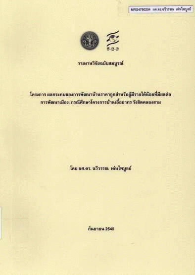 ผลกระทบของการพัฒนาบ้านราคาถูกสำหรับผู้มีรายได้น้อยที่มีผลต่อการพัฒนาเมือง : กรณีศึกษาโครงการบ้านเอื้ออาทร รังสิตคลอง 3 / ฉวีวรรณ เด่นไพบูลย์