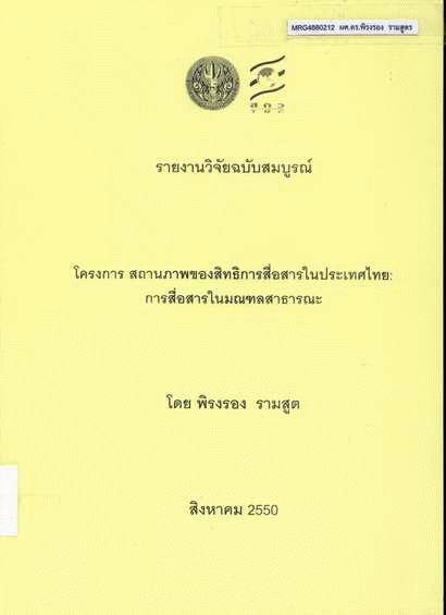 สถานภาพของสิทธิการสื่อสารในประเทศไทย : การสื่อสารในมณฑลสาธารณะ / พิรงรอง รามสูต.