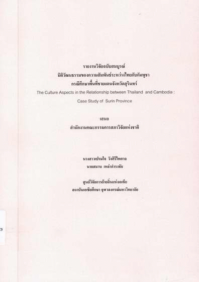มิติวัฒนธรรมของความสัมพันธ์ระหว่างไทยกับกัมพูชา กรณีศึกษาพื้นที่ชายแดนจังหวัดสุรินทร์ / เปรมใจ วังศิริไพศาล และสมาน เหล่าดำรงชัย.