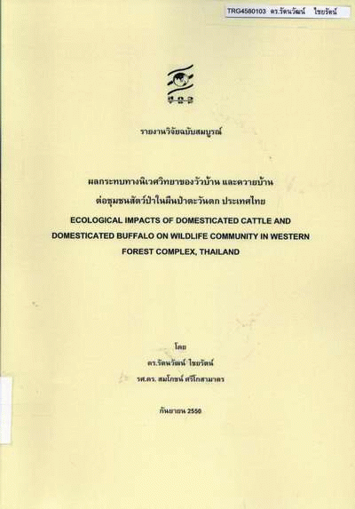 ผลกระทบทางนิเวศวิทยาของวัวบ้าน และควายบ้านต่อชุมชนสัตว์ป่าในผืนป่าตะวันตก ประเทศไทย / รัตนวัฒน์ ไชยรัตน์ และสมโภชน์ ศรีโกสามาตร