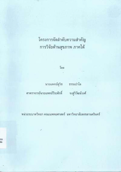 โครงการจัดลำดับความสำคัญการวิจัยด้านสุขภาพ ภาคใต้ / สุวิช ธรรมปาโล และวีระศักดิ์ จงสู่วิวัฒน์วงศ์.