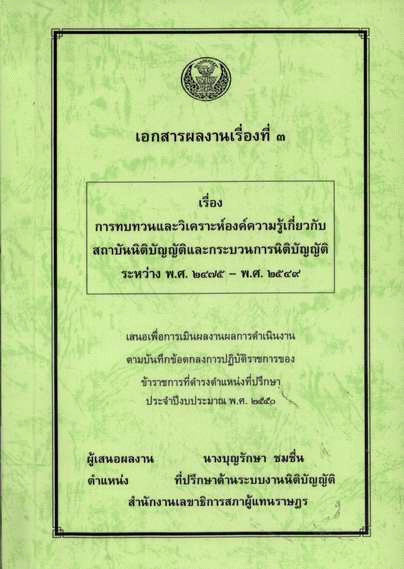 การทบทวนและวิเคราะห์องค์ความรู้เกี่ยวกับสถาบันนิติบัญญัติและกระบวนการนิติบัญญัติ ระหว่าง พ.ศ. 2475-2549 : เอกสารผลงานเรื่องที่ 3 / บุญรักษา ชมชื่น.