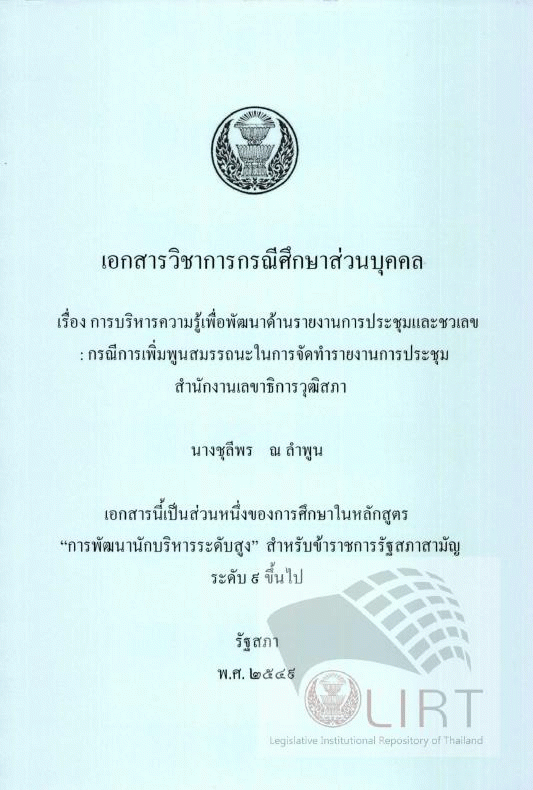การบริหารความรู้เพื่อพัฒนาด้านรายงานการประชุมและชวเลข : กรณีการเพิ่มพูนสมรรถนะในการจัดทำรายงานการประชุม สำนักงานเลขาธิการวุฒิสภา / ชุลีพร ณ ลำพูน