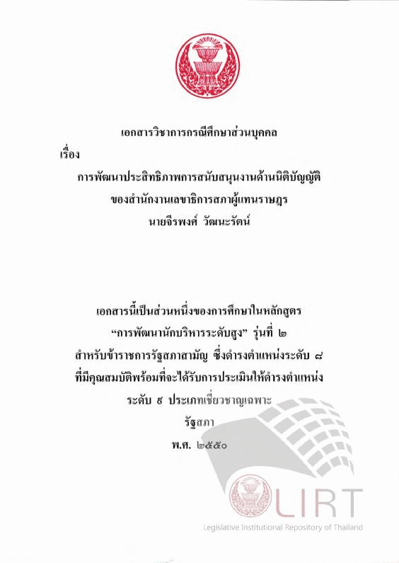 การพัฒนาประสิทธิภาพการสนับสนุนงานด้านนิติบัญญัติของสำนักงานเลขาธิการสภาผู้แทนราษฎร / จีรพงศ์ วัฒนะรัตน์