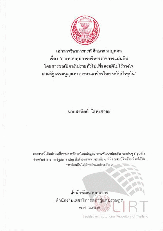 การควบคุมการบริหารราชการแผ่นดินโดยการขอเปิดอภิปรายทั่วไปเพื่อลงมติไม่ไว้วางใจตามรัฐธรรมนูญแห่งราชอาณาจักรไทย ฉบับปัจจุบัน / สานิตย์ โลหะชาละ.