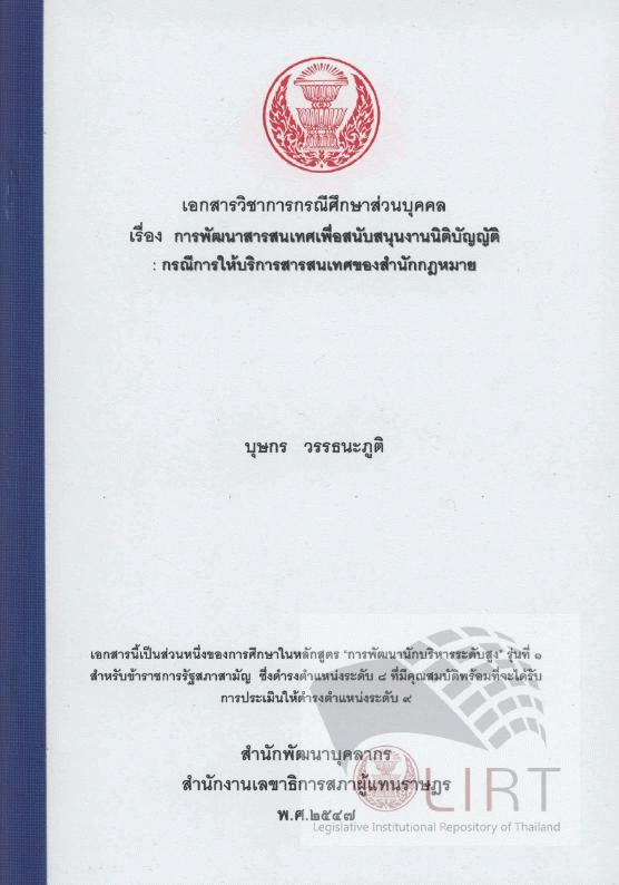 การพัฒนาสารสนเทศเพื่อสนับสนุนงานนิติบัญญัติ : กรณีการให้บริการสารสนเทศของสำนักกฎหมาย / บุษกร วรรธนะภูติ