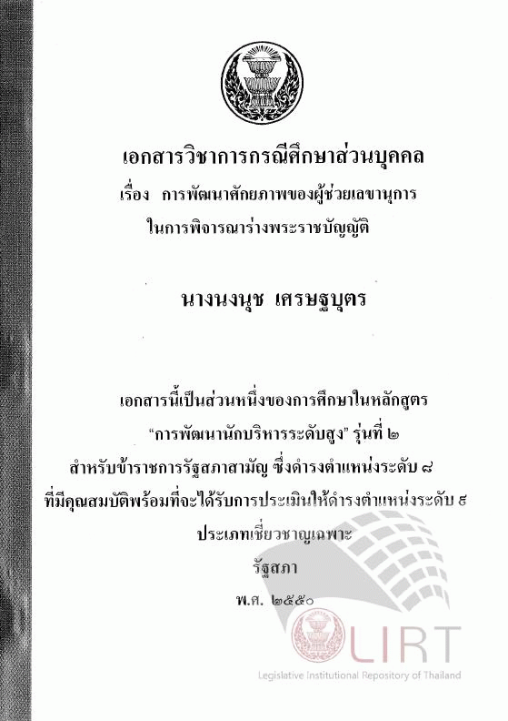 การพัฒนาศักยภาพของผู้ช่วยเลขานุการในการพิจารณาร่างพระราชบัญญัติ / นงนุช เศรษฐบุตร