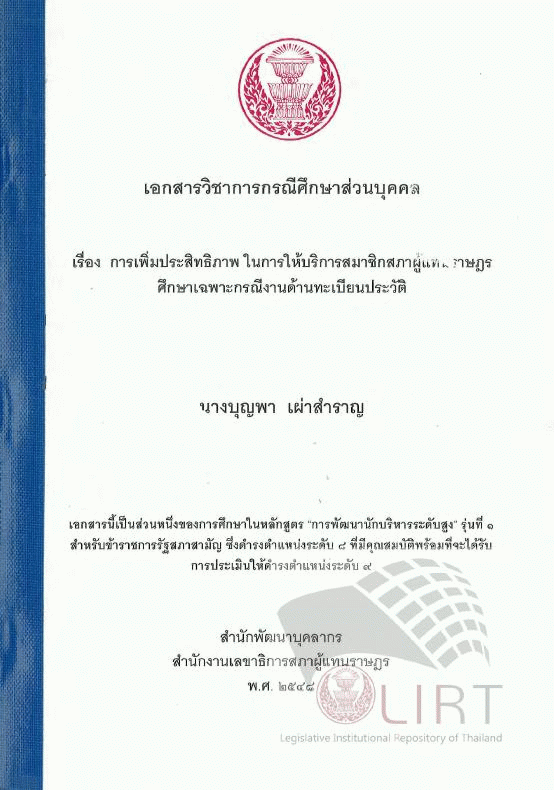 การเพิ่มประสิทธิภาพ ในการให้บริการสมาชิกสภาผู้แทนราษฎร ศึกษาเฉพาะกรณีงานด้านทะเบียนประวัติ / บุญพา เผ่าสำราญ
