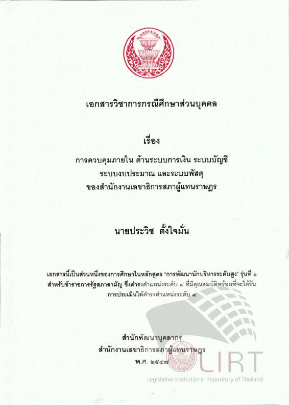 การควบคุมภายในด้านระบบการเงิน ระบบบัญชี ระบบงบประมาณ และระบบพัสดุ ของสำนักงานเลขาธิการสภาผู้แทนราษฎร / ประวิช ตั้งใจมั่น