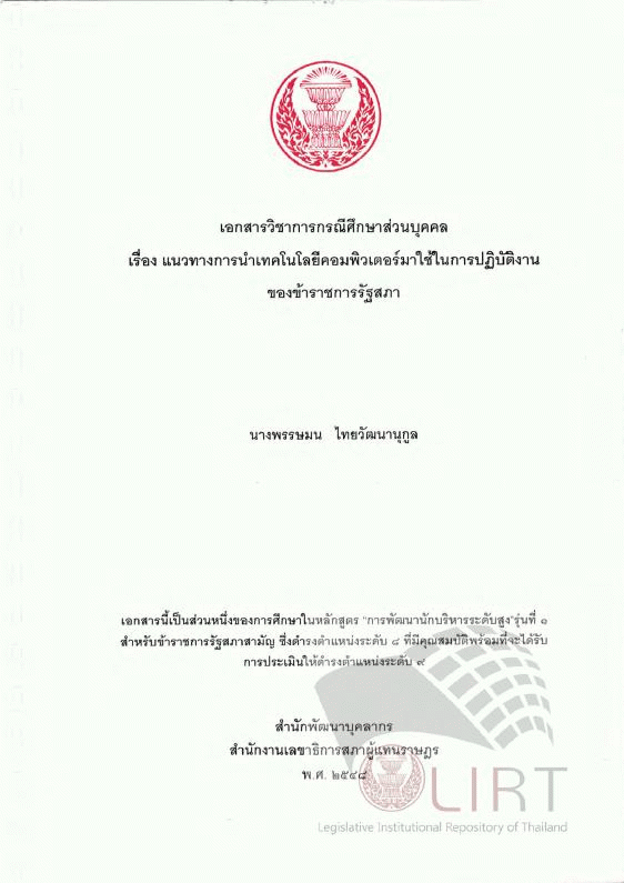 แนวทางการนำเทคโนโลยีคอมพิวเตอร์มาใช้ในการปฏิบัติงานของข้าราชการรัฐสภา / พรรษมน ไทยวัฒนานุกูล.
