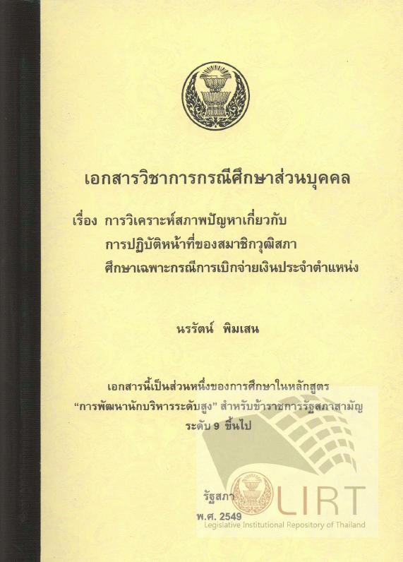 การวิเคราะห์สภาพปัญหาเกี่ยวกับการปฏิบัติหน้าที่ของสมาชิกวุฒิสภา ศึกษาเฉพาะกรณีการเบิกจ่ายเงินประจำตำแหน่ง / นรรัตน์ พิมเสน.