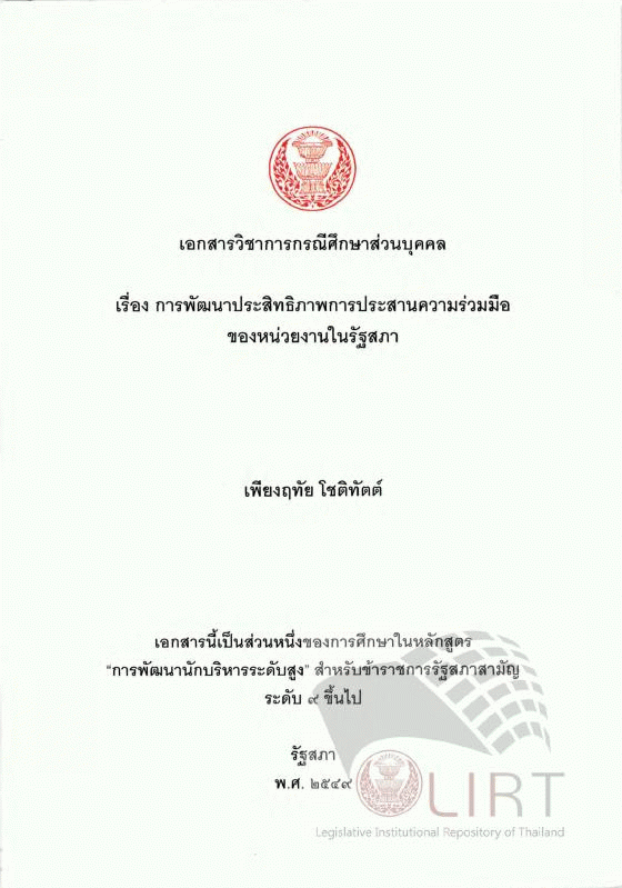 การพัฒนาประสิทธิภาพการประสานความร่วมมือของหน่วยงานในรัฐสภา / จุไร เจริญสุข
