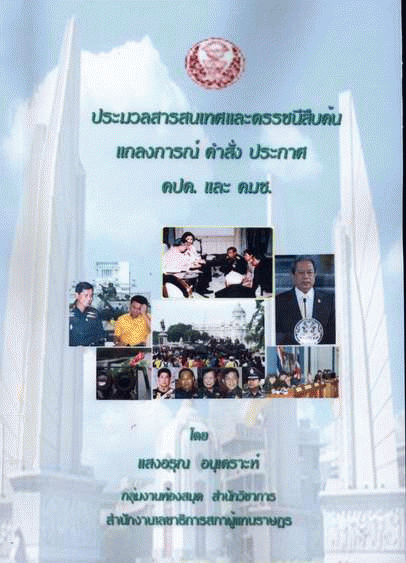 ประมวลสารสนเทศและดรรชนีสืบค้น แถลงการณ์ คำสั่ง ประกาศ คปค. และ คมช. / แสงอรุณ อนุเคราะห์