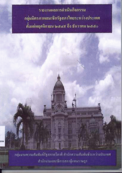 รายงานผลการดำเนินกิจกรรมกลุ่มมิตรภาพสมาชิกรัฐสภาไทยระหว่างประเทศ ตั้งแต่พฤศจิกายน 2549 ถึงธันวาคม 2550 / สำนักความสัมพันธ์ระหว่างประเทศ สำนักงานเลขาธิการสภาผู้แทนราษฎร.