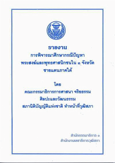 รายงานการพิจารณาศึกษากรณีปัญหาพระสงฆ์ และพุทธศาสนิกชนใน 3 จังหวัดชายแดนภาคใต้ โดยคณะกรรมาธิการการศาสนา จริยธรรม ศิลปะและวัฒนธรรม สภานิติบัญญัติแห่งชาติ ทำหน้าที่วุฒิสภา / สำนักกรรมาธิการ 3 สำนักงานเลขาธิการวุฒิสภา.