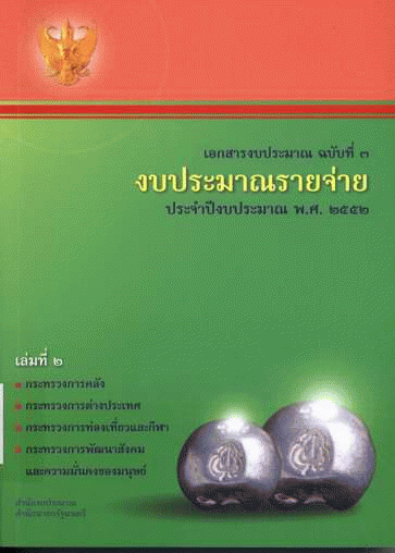 เอกสารงบประมาณ ฉบับที่ 3 งบประมาณรายจ่าย ประจำปีงบประมาณ พ.ศ. 2552 เล่มที่ 2 กระทรวงการคลัง กระทรวงการต่างประเทศ กระทรวงการท่องเที่ยวและกีฬา กระทรวงการพัฒนาสังคมและความมั่นคงของมนุษย์ / สำนักงบประมาณ.