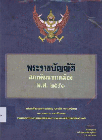 พระราชบัญญัติสภาพัฒนาการเมือง พ.ศ. 2551 พร้อมทั้งสรุปสาระสำคัญ ประวัติ ความเป็นมา กระบวนการและขั้นตอนในการตราพระราชบัญญัติดังกล่าวของสภานิติบัญญัติแห่งชาติ / สำนักงานเลขาธิการวุฒิสภา. สำนักกฎหมาย