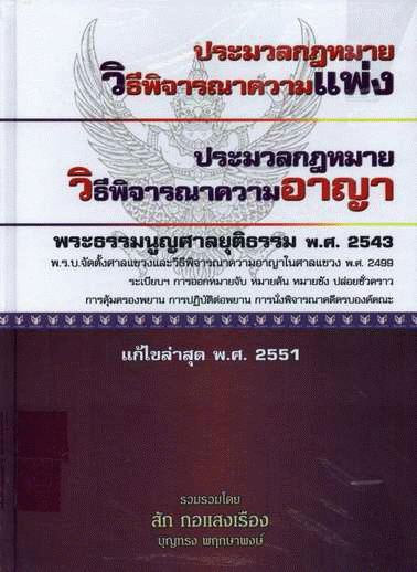 ประมวลกฎหมายวิธีพิจารณาความแพ่ง ประมวลกฎหมายวิธีพิจารณาความอาญา พระธรรมนูญศาลยุติธรรม พ.ศ. 2543...แก้ไขล่าสุด พ.ศ. 2551 / รวบรวมโดย สัก กอแสงเรือง, บุญทรง พฤกษาพงษ์.